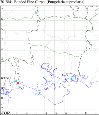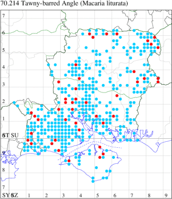 Common in coniferous woodland, plantations and gardens throughout the British Isles. Widespread and common in Hampshire and on the Isle of Wight. Wingspan 28-34 mm. Worn specimens could be misidentified as Dusky Peacock M. signaria, an extremely rare immigrant, which see. Larva feeds on various coniferous trees, including Scots Pine and Norway Spruce, over-wintering as a pupa.