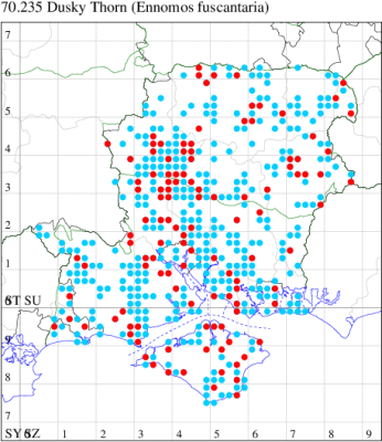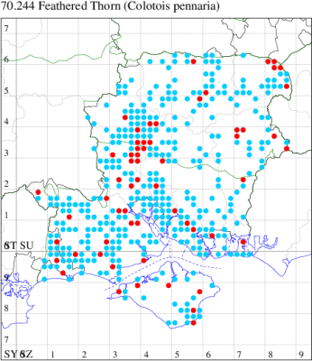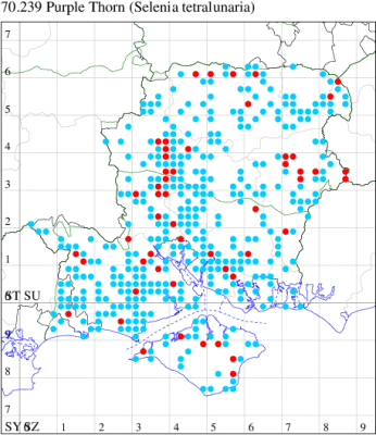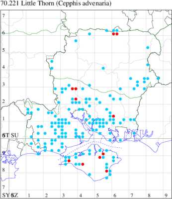 Nationally scarce (Nb) in open woodland, woodland rides and scrub in southern England (Hampshire and adjoining counties) and from north Somerset up through Gloucestershire and Monmouthshire into Herefordshire, with a few isolated populations elsewhere in England and southern Ireland. In Hampshire and on the Isle of Wight local but quite frequent in many woodland localities. Wingspan 27-30 mm. Small size renders this 'thorn' fairly unmistakable. Larva feeds on Bramble, in neutral or basic habitats, or Bilberry in those which are acid, over-wintering as a pupa.
