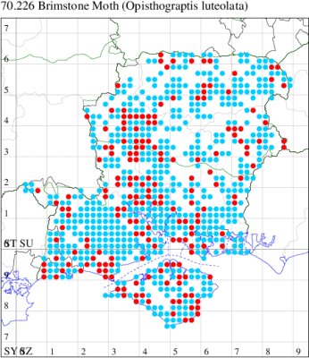 Common in woodland, scrub, hedgerows, parks and gardens throughout England, Wales and southern Scotland. Widespread and common in Hampshire and on the Isle of Wight. Wingspan 27-34 mm. Larva feeds on Hawthorn, Blackthorn, Plum, Wild Cherry and Crab Apple, over-wintering as a pupa.