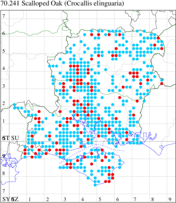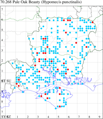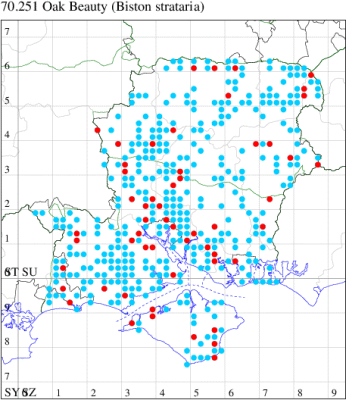 Common in broad-leaved woodland, areas with scattered trees, scrub, hedgerows, parks and gardens throughout the British Isles. Widespread and common in Hampshire and on the Isle of Wight. Wingspan 42-54 mm. Larva feeds on Pedunculate Oak, Hawthorn, Blackthorn, Hazel, Downy and Silver Birch, Elm, Sallow, Horse Chestnut, Sweet Chestnut and Beech.