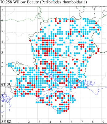 Common in broad-leaved, often damp, woodland throughout much of the British Isles; frequently recorded and well distributed across Hampshire and the Isle of Wight. Wingspan 30-35 mm. The main confusion species is Common White Wave C. pusaria, in which the cross-lines are straight and grey. Larva feeds on Goat Willow, Grey Willow, Aspen and Poplar, over-wintering as a pupa.