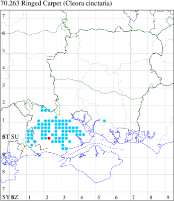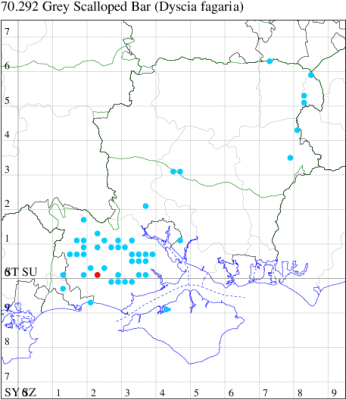 Common in woodland, scrub, hedgerows and gardens throughout England and Wales, less frequently, but increasingly, in the north. Widespread and fairly common in Hampshire and on the Isle of Wight. Wingspan 27-31 mm. Can be confused with very faded examples of Green Carpet Colostygia pectinataria. Larva feeds on Blackthorn and Hawthorn, over-wintering as a pupa.