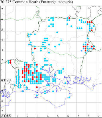 Local on heathland, open woodland, moorland and bogs throughout the British Isles. In Hampshire fairly common on the heaths of the New Forest and in the north-east, but very local elsewhere. Not recorded from the Isle of Wight since 1948. Wingspan 36-41 mm. The most likely confusion species is Common Heath Ematurga atomaria, especially pale forms. Larva feeds on Heather, Bell Heather, Broom and Petty Whin.