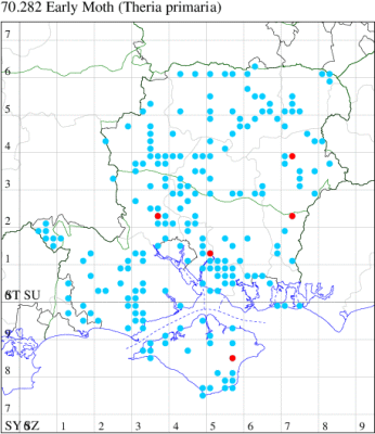 Common in open woodland, woodland edges, scrub and mature hedgerows throughout England, Wales and southern Scotland. In Hampshire and on the Isle of Wight common to abundant in late winter amongst hawthorn in open country and on the downs. Wingspan male 32-37 mm, female wingless. Males could be confused with Sloe Carpet Aleucis distinctata, but Early Moth has straighter distal edge of central band and females have band on vestigial wings. The flightless females may be found sitting on the leafless twigs after dark. Larva feeds on Blackthorn, Hawthorn and Midland Hawthorn.