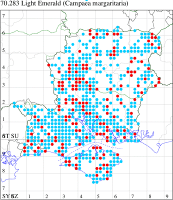 Common wherever there are coniferous trees throughout the British Isles. Widespread and fairly common in Hampshire and on the Isle of Wight. Wingspan 32-44 mm. Occasional green individuals of the form f. prasinaria, which can be confused with Light Emerald Campaea margaritata, are reported. Larva feeds on various coniferous trees, including Scots Pine, Norway Spruce and European Larch.