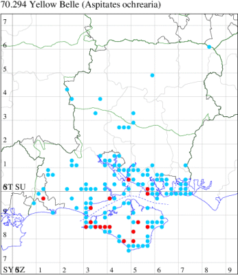 Local on sand-dunes, shingle beaches, saltmarshes, golf courses and heathland, along the coasts of southern England, predominantly coastal. In Hampshire and on the Isle of Wight frequent on dunes and shingle in coastal localities, rare inland on the chalk. Wingspan 28-36 mm. The most likely confusion species is Straw Belle Aspitates gilvaria, but Yellow Belle has a more rounded forewing and more distinct antemedian fascia. Larva feeds on Sea Wormwood, Hare's-foot Clover, Smooth Tare, Bird's-foot Trefoil, Common Restharrow, Wild Carrot and Beaked Hawk's-beard.