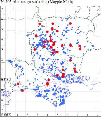 Common on moorland, in gardens and allotments throughout much of the British Isles. In Hampshire and on the Isle of Wight widespread, but far less common than in the past - it used to be a common garden moth throughout the region. Wingspan 42-48 mm. Unmistakable. Larva feeds on Heather, Blackthorn, Hawthorn, Hazel, Black Currant, Red Currant, Gooseberry and Spindle.
