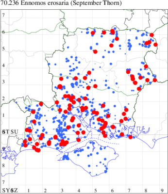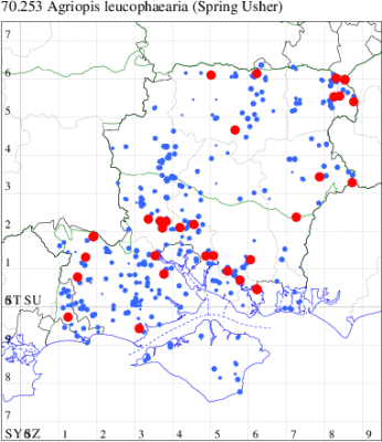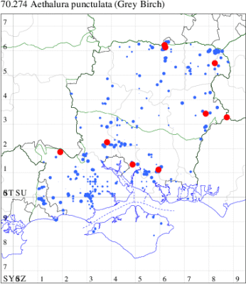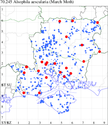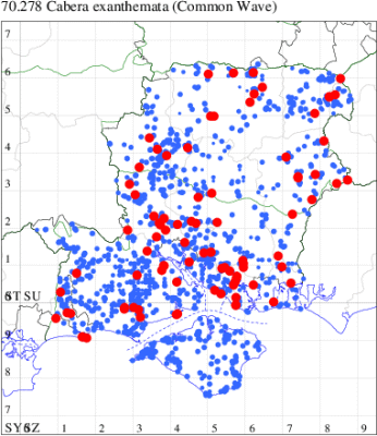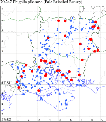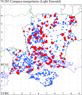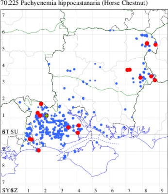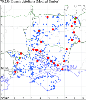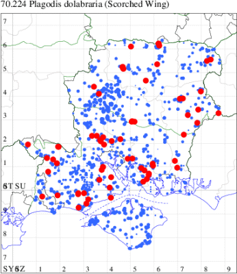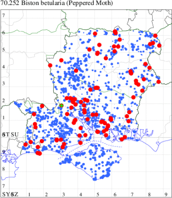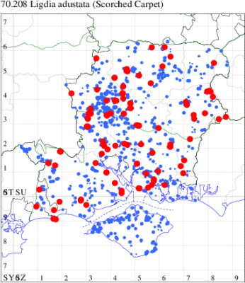 For the maps, all records prior to 2023 are shown by a blue dot (the larger the dot, the more recent), with the current year's records shown in red. As previous records are superimposed on any report for 2023, new sites have greater emphasis (i.e. will show as 'more red').