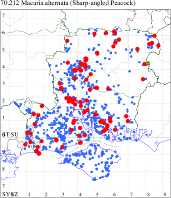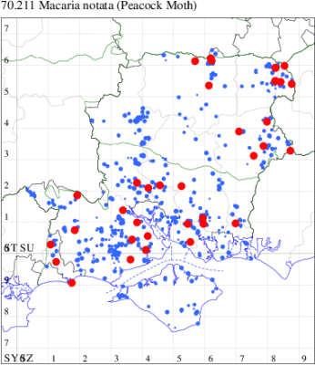 Local in broad-leaved woodland, scrubby heathland and sand-dunes throughout much of England, more commonly in the south. In Hampshire and on the Isle of Wight fairly common throughout, being the rather more common of the two similar Macaria species. Wingspan 27-32 mm. The main confusion species is Peacock Moth M. notata, but in M. alternata there is usually an indistinct grey band running through the blotch in the centre of the forewing, across both forewing and hindwing, and the apical markings are bolder, accentuating the more pointed apex and deeper notch in the termen. Larva feeds on Sallow, Blackthorn, Sea Buckthorn and Alder, over-wintering as a pupa.