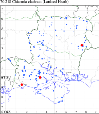 Common in farmland, gardens, calcareous grassland, acid heathland and moorland throughout most of the British Isles, a species of conservation concern under the UK Biodiversity Action Plan. In Hampshire and on the Isle of Wight quite common on the chalk and in waste places with clover, and also found in clover crops. Wingspan 26-32 mm. Flies both by day, in warm sunshine, and at night. Although distinctive, it has been confused with Common Heath Ematurga atomaria, but only Latticed Heath has such conspicuous, black veins; there is a confusing black form alboguttata, which is best distinguished by the chequered fringes. Larva feeds on Hare's-foot Clover, White Clover, Red Clover, Bird's-foot Trefoil and Lucerne, over-wintering as a pupa.