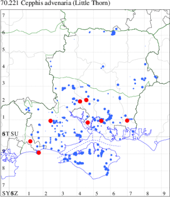 VC11: Earliest: Hengistbury Head, 23 Apr, 2 (BKin) Latest: Coulters Dean, Buriton, 17 Aug, 1 (LHou) Max count: Culverley, NF, 30 May, 20 (CLew)