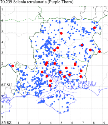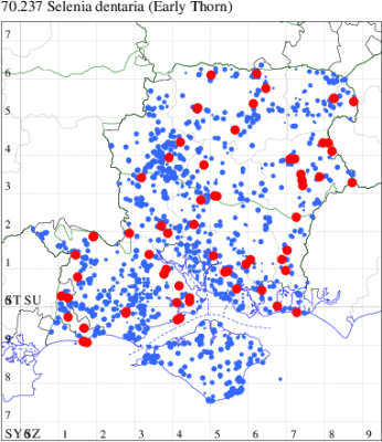 Nationally scarce (Nb) in open woodland, woodland rides and scrub in southern England (Hampshire and adjoining counties) and from north Somerset up through Gloucestershire and Monmouthshire into Herefordshire, with a few isolated populations elsewhere in England and southern Ireland. In Hampshire and on the Isle of Wight local but quite frequent in many woodland localities. Wingspan 27-30 mm. Small size renders this 'thorn' fairly unmistakable. Larva feeds on Bramble, in neutral or basic habitats, or Bilberry in those which are acid, over-wintering as a pupa.