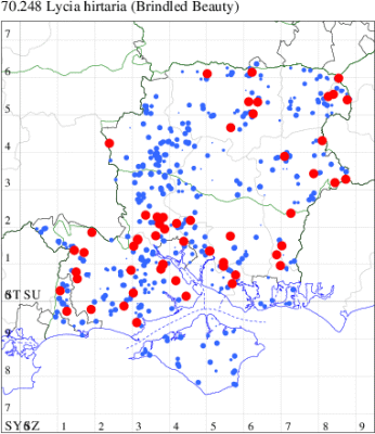 VC11: Marchwood, one, 11 May; North Gate, NF, one, field observation, 16 May (TDCh); Moorgreen Meadows SSSI, Eastleigh, present, field observation, 09 May (GgBak); Hengistbury Head, six, 14 May (PWet); four, 15 May (MoTay); four, 16 May (BKin); one, 18 May (RPH); two, 05 Jun (FM-S); one, 14 Jun; one, 03 Sep; two, 04 Sep; three, 05 Sep; two, 06 Sep; one, 07 Sep (MJef); one, field observation, 22 Aug (PBoa); Blackbush, Milford-on-Sea, one, 28 May (MBot); Lisle Court, Lymington, one, 08 Sep (AMus, JPMar det. JPM); present, 09 Sep (MPrnc); present, 08 Sep (AMus); Needs Ore NNR, one, 09 Aug; 15, 16 Aug (CNB); Needs Ore, two, field observation, 22 Aug (RAC); Browndown, two, 01 Sep; Browndown Coastal Ranges, one, 01 Sep (F.M.G.)