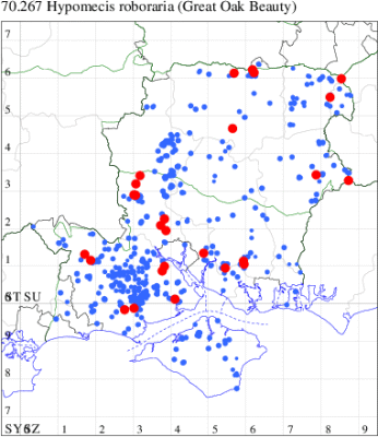 Common in broad-leaved woodland, areas with scattered trees, scrub, hedgerows, parks and gardens throughout the British Isles. Widespread and common in Hampshire and on the Isle of Wight. Wingspan 42-54 mm. Larva feeds on Pedunculate Oak, Hawthorn, Blackthorn, Hazel, Downy and Silver Birch, Elm, Sallow, Horse Chestnut, Sweet Chestnut and Beech.