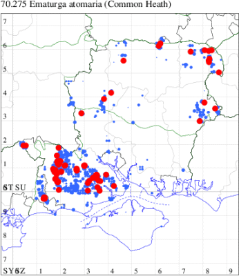 Local on heathland, open woodland, moorland and bogs throughout the British Isles. In Hampshire fairly common on the heaths of the New Forest and in the north-east, but very local elsewhere. Not recorded from the Isle of Wight since 1948. Wingspan 36-41 mm. The most likely confusion species is Common Heath Ematurga atomaria, especially pale forms. Larva feeds on Heather, Bell Heather, Broom and Petty Whin.