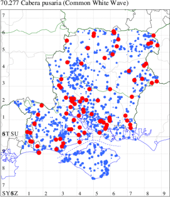 Common in broad-leaved, often damp, woodland throughout much of the British Isles; frequently recorded and well distributed across Hampshire and the Isle of Wight. Wingspan 30-35 mm. The main confusion species is Common White Wave C. pusaria, in which the cross-lines are straight and grey. Larva feeds on Goat Willow, Grey Willow, Aspen and Poplar, over-wintering as a pupa.