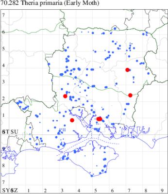 Common in open woodland, woodland edges, scrub and mature hedgerows throughout England, Wales and southern Scotland. In Hampshire and on the Isle of Wight common to abundant in late winter amongst hawthorn in open country and on the downs. Wingspan male 32-37 mm, female wingless. Males could be confused with Sloe Carpet Aleucis distinctata, but Early Moth has straighter distal edge of central band and females have band on vestigial wings. The flightless females may be found sitting on the leafless twigs after dark. Larva feeds on Blackthorn, Hawthorn and Midland Hawthorn.