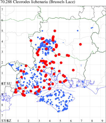 Local in scrub, woodland, plantations and rocky areas by the sea, in south-west England, west Wales and the west coast of Scotland, also in a few places in central and southern England. In Hampshire and on the Isle of Wight this species all but disappeared in the second half of the 1940s, but has increased dramatically in the last few years, and is now to be found throughout the New Forest, in the Test Valley around Leckford and Chilbolton, and on the Isle of Wight. Wingspan 31-38 mm. Fairly unmistakable. Larva feeds on various lichens.