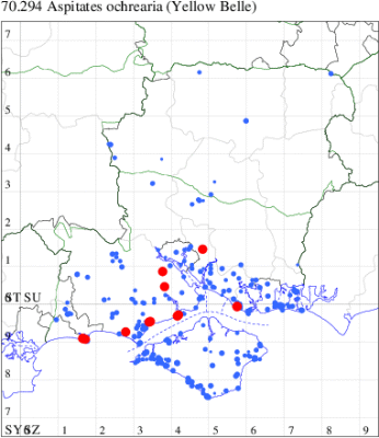 Local on sand-dunes, shingle beaches, saltmarshes, golf courses and heathland, along the coasts of southern England, predominantly coastal. In Hampshire and on the Isle of Wight frequent on dunes and shingle in coastal localities, rare inland on the chalk. Wingspan 28-36 mm. The most likely confusion species is Straw Belle Aspitates gilvaria, but Yellow Belle has a more rounded forewing and more distinct antemedian fascia. Larva feeds on Sea Wormwood, Hare's-foot Clover, Smooth Tare, Bird's-foot Trefoil, Common Restharrow, Wild Carrot and Beaked Hawk's-beard.