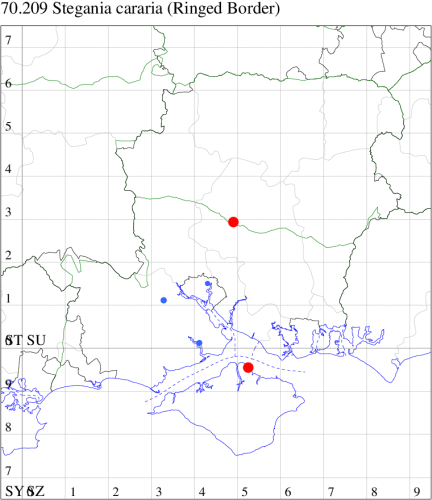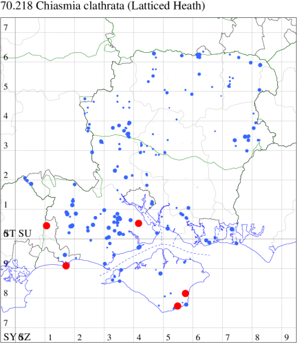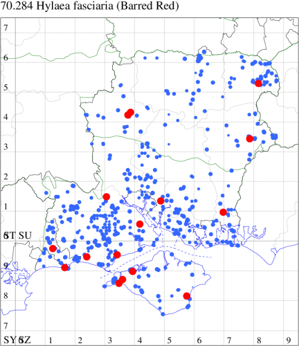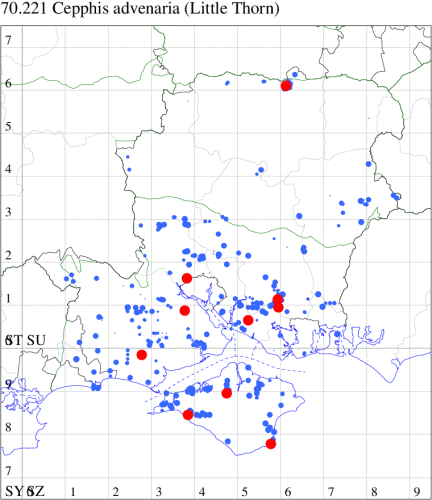 VC11: Marchwood, one, 17 Sep (CTha); Lee-on-Solent, one, 31 Aug; one, 02 Sep; one, 03 Sep; one, 06 Sep; one, 07 Sep; one, 08 Sep (IHrg); Hengistbury Head, two, 06 Jun (RPH); Hengistbury Head NNR, four, 15 May (MJef); three, 17 May (RPH); three, 18 May; four, 19 May; four, 20 May (MJef); one, 22 May (BKin det. MJef); six, 23 May (RPH); three, 30 May (BKin det. MJef); one, 02 Jun (RPH); two, 10 Jun (BKin det. MJef); one, 12 Jun (MJef); one, 11 Aug; one, 12 Aug (MoTay det. MJef); one, 14 Aug (RPH); two, 27 Aug (HengistH det. MJef); one, 29 Aug (MJef); one, 03 Sep (HengistH det. MJef); one, 14 Sep (BKin det. MJef); four, 15 Sep; one, 18 Sep (HengistH det. MJef); Hengistbury Head, four, 27 Aug (MJef); Pennington, one, 01 Sep (RFC)
