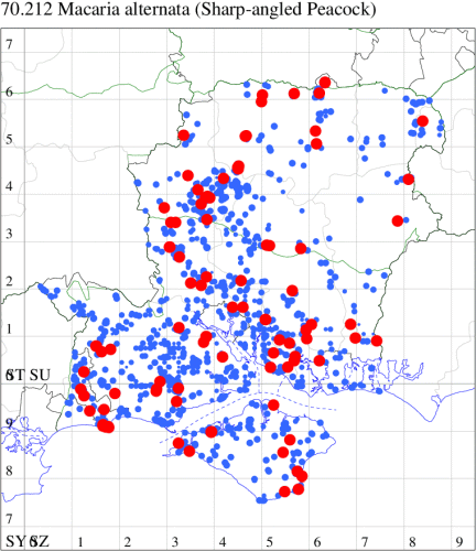 Local in broad-leaved woodland, scrubby heathland and sand-dunes throughout much of England, more commonly in the south. In Hampshire and on the Isle of Wight fairly common throughout, being the rather more common of the two similar Macaria species. Wingspan 27-32 mm. The main confusion species is Peacock Moth M. notata, but in M. alternata there is usually an indistinct grey band running through the blotch in the centre of the forewing, across both forewing and hindwing, and the apical markings are bolder, accentuating the more pointed apex and deeper notch in the termen. Larva feeds on Sallow, Blackthorn, Sea Buckthorn and Alder, over-wintering as a pupa.
