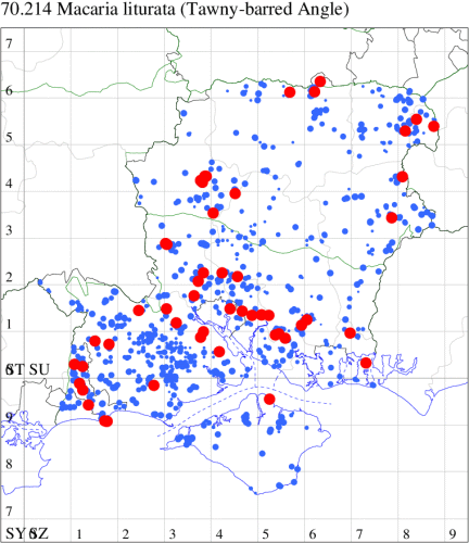 Common in coniferous woodland, plantations and gardens throughout the British Isles. Widespread and common in Hampshire and on the Isle of Wight. Wingspan 28-34 mm. Worn specimens could be misidentified as Dusky Peacock M. signaria, an extremely rare immigrant, which see. Larva feeds on various coniferous trees, including Scots Pine and Norway Spruce, over-wintering as a pupa.