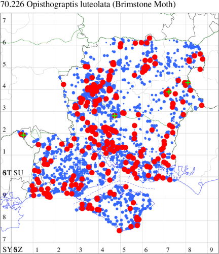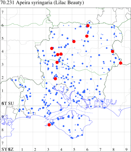 VC11: Copythorne, one, 20 May (JAda); Dibden Purlieu, NF, one, 01 Jul (RAC); Waterlooville, one, 02 Jun (DWhe); Hurn, one, 25 Jul (MJef); Hengistbury Head NNR, one, 14 Aug; New Milton, one, 29 Jul (RPH); Lisle Court, Lymington, present, , 05 Jun (JJL);