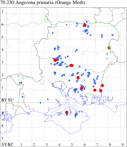For the maps, all records prior to 2024 are shown by a blue dot (the larger the dot, the more recent), with the current year's records shown in red. As previous records are superimposed on any report for 2024, new sites have greater emphasis (i.e. will show as 'more red').