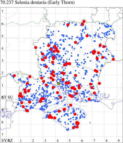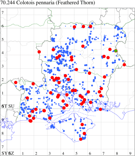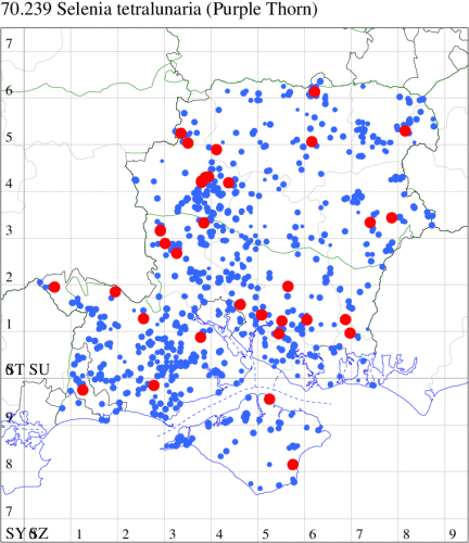 Nationally scarce (Nb) in open woodland, woodland rides and scrub in southern England (Hampshire and adjoining counties) and from north Somerset up through Gloucestershire and Monmouthshire into Herefordshire, with a few isolated populations elsewhere in England and southern Ireland. In Hampshire and on the Isle of Wight local but quite frequent in many woodland localities. Wingspan 27-30 mm. Small size renders this 'thorn' fairly unmistakable. Larva feeds on Bramble, in neutral or basic habitats, or Bilberry in those which are acid, over-wintering as a pupa.