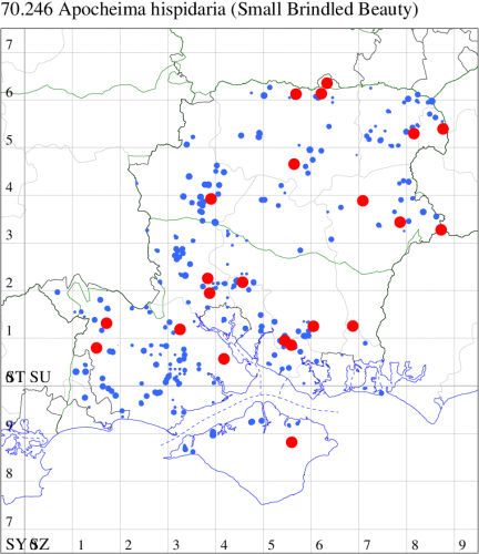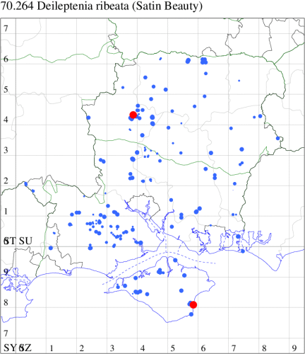 VC11: Broughton, two, 29 Jul; two, 29 Jul; Ashley, two, 07 Aug; Little Somborne, one, 09 Aug (GCE); Sparsholt Equine Centre, one, field obs., 24 Aug (VWalk det. Unkn.); Brownwich Cliffs, Titchfield, three, 26 Jul; five, 16 Aug (F.M.G.); Funtley, one, 23 Jul (TDC); Fareham, one, 22 Jun; one, 26 Jun (ADT); Botley, one, 13 Aug (SLB); Dean, Bishop's Waltham, present, 21 Jun; present, 25 Jun; present, 29 Jun; present, 13 Jul; present, 18 Jul; present, 30 Jul; present, 01 Aug; present, 12 Aug (CMor); Bishops Waltham, one, field obs., 23 Aug; Dundridge, one, field obs., 17 Jul (DTru); Wickham, one, 28 Jun (JRDS); Portchester, one, 24 Jun (DH-J); Portsmouth, one, 19 Jul (IRT); Lovedean, one, 17 Jun; one, 18 Jun; one, 22 Jun; one, 23 Jun; one, 25 Jun; one, 26 Jun (ARJa); Hurn, one, 31 Jul; one, 01 Aug; two, 02 Aug (MJef); Hengistbury Head NNR, one, 07 Aug (HengistH det. MJef); one, 09 Aug (BKin det. MJef); three, 12 Aug (MoTay det. MJef); one, 14 Aug (RPH); Hengistbury Head, nine, 30 Jul (MJef); Burton, nr Christchurch, one, 30 Jul (JStw); Browndown, one, 09 Aug (F.M.G.);