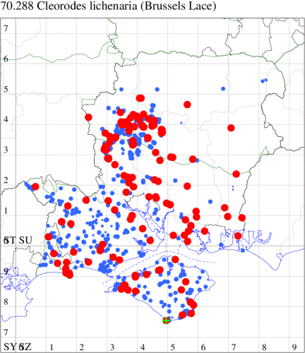 Local in scrub, woodland, plantations and rocky areas by the sea, in south-west England, west Wales and the west coast of Scotland, also in a few places in central and southern England. In Hampshire and on the Isle of Wight this species all but disappeared in the second half of the 1940s, but has increased dramatically in the last few years, and is now to be found throughout the New Forest, in the Test Valley around Leckford and Chilbolton, and on the Isle of Wight. Wingspan 31-38 mm. Fairly unmistakable. Larva feeds on various lichens.