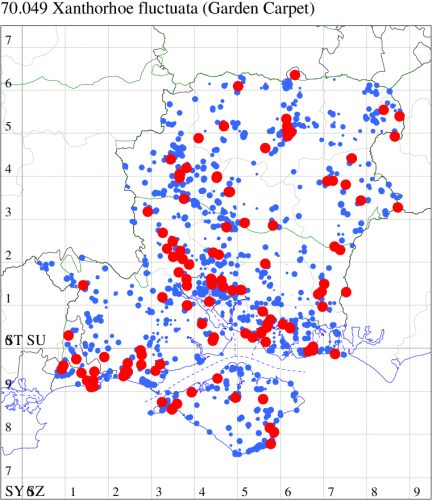 Common in gardens, woodland, hedgerows, downs, fens, moors and sand-dunes throughout the British Isles, a species of conservation concern under the UK Biodiversity Action Plan. Widespread and common in Hampshire, but rather scarce on the Isle of Wight, with just four records there so far this century. Wingspan 24-27 mm. Very similar in form to Red Twin-spot Carpet X. spadicearia, which see; the red form, which has yet to be reliably identified from Hampshire, should be treated as indistinguishable without dissection of the genitalia. Larva feeds on Bedstraw, Ground-ivy and Dock, over-wintering as a pupa.