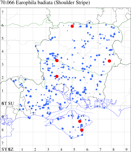VC11: Brockwood, one, 30 May (SDut); Blashford Lakes HIWWT NR, two, 16 Jul; one, 21 Sep (PWhtk); one, field obs., 14 May (GLes); two, 16 Jul (PWhtk); Romsey, two, 11 Aug (NRJ); Bevois Valley, Southampton, one, 10 Aug (MCrei); Allbrook, one, 15 May; one, 21 Jul; one, 17 Aug (SIng); Brownwich Cliffs, Titchfield, one, 16 Aug (F.M.G.); South Holt Farm, NF, one, 28 Aug (CGree det. OHen); Merritown Heath, present, 17 Aug (DFoo); Browndown, three, 09 Aug (F.M.G.);