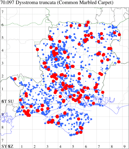 VC11: Marchwood, one, 11 Aug (CTha); Woodlands, NF, one, 01 Aug (RBW); Cromarty Pond area, Lord's Hill, one, 12 Jul; one, 18 Jul (JClx); North Baddesley, one, 17 Jul; two, 19 Jul (RWPas); East Tytherley, one, 27 Jul (GCE); Mottisfont Abbey NT, nr Romsey, one, 01 Jul; one, 17 Jul; one, 23 Jul (TSto); Romsey, one, 23 Jul; present, 24 Jul; one, 30 Jul; one, 31 Jul (SRC); Fishlake Meadows, one, 12 Aug (NRJ); Romsey, one, 18 Jul; one, 23 Jul; two, 11 Aug (MJB); one, 22 Jul; two, 30 Jul (NRJ); Ashley, one, 13 Jul (GCE); Swaythling, Southampton, present, 30 Jul (MEdg); Southampton, one, 26 Jul (MGP); Itchen Valley CP, four, 19 Jul (CTha); Itchen Valley C.P., three, 19 Jul (F.M.G.); Allbrook, one, 07 Jun; three, 11 Jul; one, 28 Jul; one, 05 Aug; one, 10 Aug; one, 11 Aug; Highbridge, Eastleigh, one, 02 Aug (SIng); Brownwich Cliffs, Titchfield, one, 26 Jul (F.M.G.); Stubbington, one, 30 Jul (DPH); Funtley, one, 11 Jul (TDC); Fareham, one, 16 Jul (ADT); Dean, Bishop's Waltham, present, 30 Jul (CMor); Wickham, two, 29 Jul; two, 30 Jul; three, 02 Aug (JRDS); Portsmouth, one, 11 Jul (IRT); Waterlooville, one, 15 Aug (DWhe); Old Winchester Hill, one, 30 Aug (F.M.G.); Horndean, one, 12 Jul (PHog); Stroud, Petersfield, two, 19 May; two, 27 Jul (RAll); Muscliffe, one, 19 Jul (CMur det. CMur,MLan); Merritown Heath, one, 29 Jun (DFoo); Hurn, one, 12 Aug (MJef); Christchurch: Cross Way, one, 12 Jul (LPyk); Burton, nr Christchurch, one, 16 Jul; one, 30 Jul (JStw);