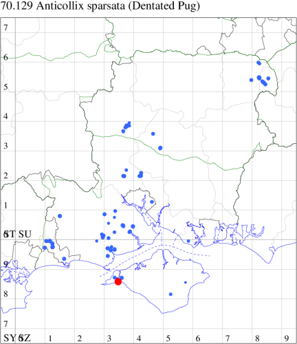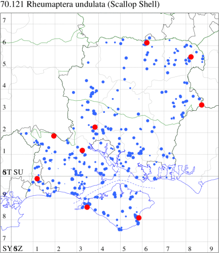 Local in fens, water meadows, damp woodland, marshes and river-banks throughout much of the British Isles, a species of conservation concern under the UK Biodiversity Action Plan. In Hampshire and on the Isle of Wight an uncommon marsh-inhabiting species, records of which are scattered thinly across the three vice-counties. Wingspan 24-27 mm. The most likely confusion species is Oblique Striped Phibalapteryx virgata, which see for differences. Larva feeds on Marsh Bedstraw and Heath Bedstraw.