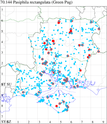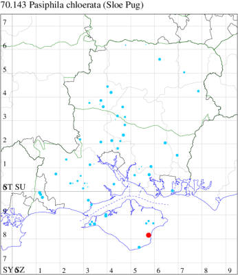 Common in mature hedgerows, scrub and woodland edges throughout much of England. In Hampshire larvae recorded in numbers from blackthorn in the past, but rather uncommon to light, mostly in the New Forest, and occasionally elsewhere in the county and on the Isle of Wight, where recorded in numbers in some years. Wingspan 17-19 mm. Similar to Green Pug P. rectangulata, but that species has postmedian line strongly toothed near costa, and Sloe Pug usually has salmon-pink (black in Green Pug) band at base of abdomen. Larva feeds on flowers of Blackthorn, over-wintering as an egg.