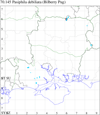 Nationally scarce (Nb) on heathland, moorland and open woodland in southern England. In Hampshire very local amongst the foodplant in open woodland in the New Forest, Alice Holt and Pamber Forest. Not recorded from the Isle of Wight since 1981. Wingspan 17-19 mm. Fairly unmistakable, although could be confused with Green Pug P. rectangulata. Larva feeds on Bilberry, over-wintering as an egg.
