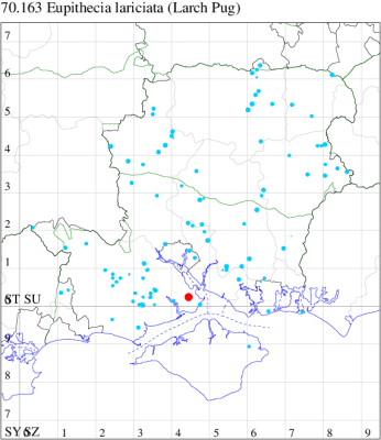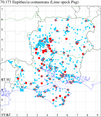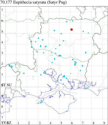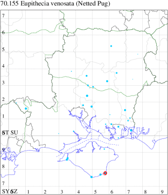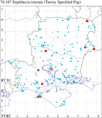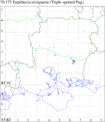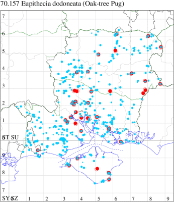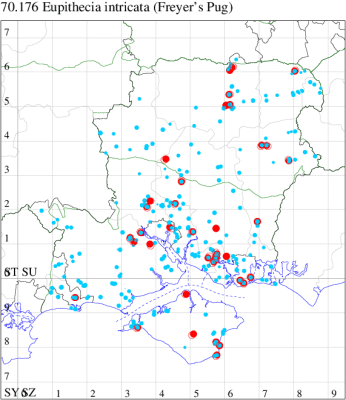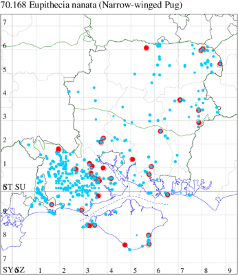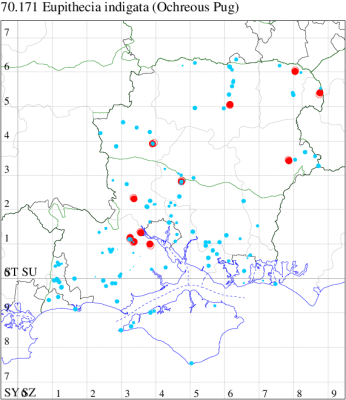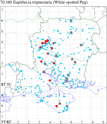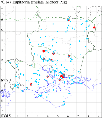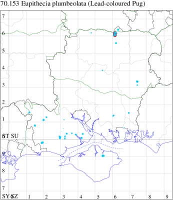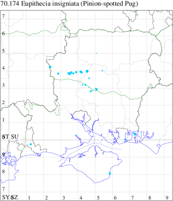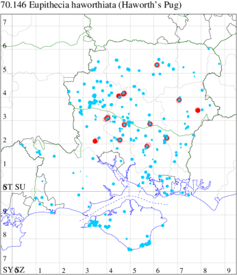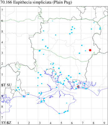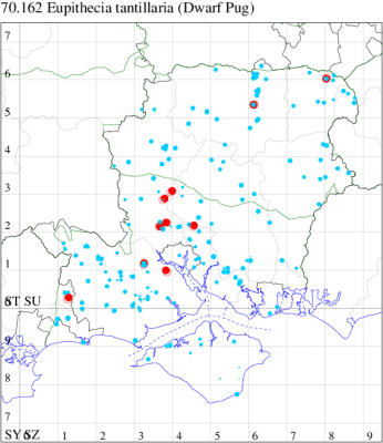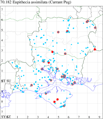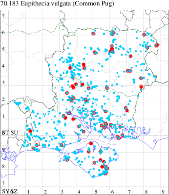 Common in gardens, allotments, hedgerows and open woodland throughout the British Isles. In Hampshire and on the Isle of Wight recorded in small numbers throughout, but easily overlooked. Wingspan 17-22 mm. The main confusion species is Wormwood Pug E. absinthiata, which is larger, with more distinct markings. Larva feeds on Hop, Black Currant and Red Currant, over-wintering as a pupa.