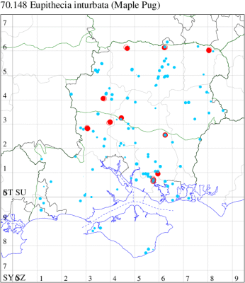 Local in woodland, hedgerows and scrub, particularly on calcareous ground throughout much of England, mostly in the south-east. In Hampshire and on the Isle of Wight rather uncommon, especially in the New Forest and on the Island. Wingspan 13-15 mm. The most likely confusion species is Slender Pug E. tenuiata, which see for differences. Larva feeds on flowers of Field Maple, over-wintering as an egg.