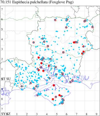Common in woodland, calcareous grassland, embankments and waste ground throughout the British Isles. Widespread and common in Hampshire and on the Isle of Wight. Wingspan 18-22 mm. The main confusion species is Toadflax Pug E. linariata: in Foxglove Pug, the outer edge of the central cross-band is kinked at the costa, while in Toadflax Pug the central cross-band is gently curved at the costa. Larva feeds within flowers of Foxglove, over-wintering as a pupa.