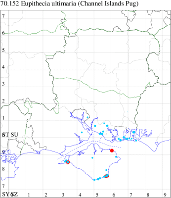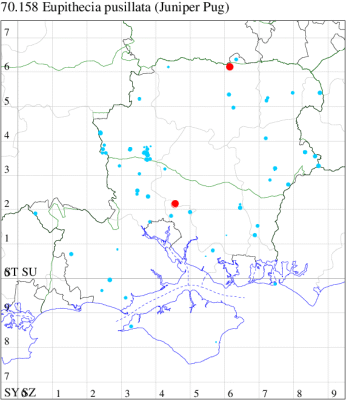 Common in gardens, parks and plantations throughout much of England. In Scotland subspecies millieraria, known proverbially as Edinburgh Pug, occurs on moorland. In Ireland subspecies hibernica, known as Mere's Pug, occurs on the limestone of the Burren. In Hampshire and on the Isle of Wight usually found in suburban localities, in association with leylandii, and can be fairly common. Wingspan 20-24 mm. A possible confusion species is Pimpinel Pug E. pimpinellata, which see for differences. Larva feeds on Juniper, Lawson's Cypress and Leyland Cypress, over-wintering as a pupa.