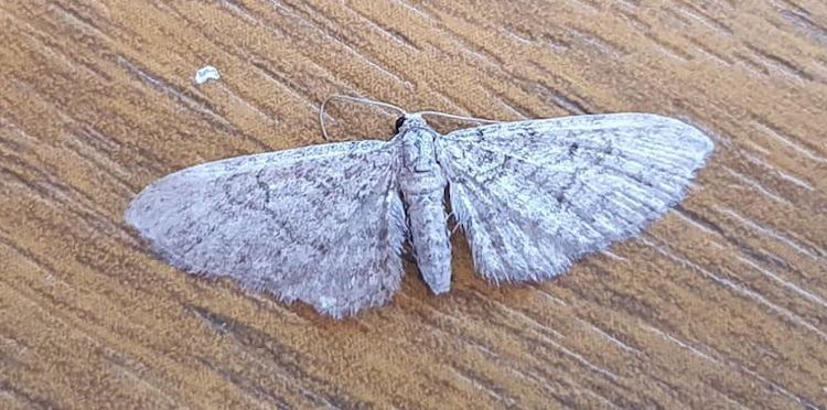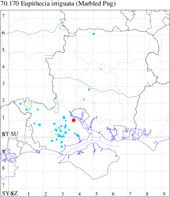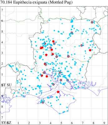 Common in woodland, scrub, hedgerows and gardens throughout England and Wales. Widespread and common in Hampshire and on the Isle of Wight. Wingspan 20-22 mm. The main confusion species is Brindled Pug E. abbreviata, which is often nearly over before the first Mottled Pug appears, and has less conspicuous discal spot and black wedges. Larva feeds on Hawthorn, Blackthorn and Dogwood, over-wintering as a pupa.
