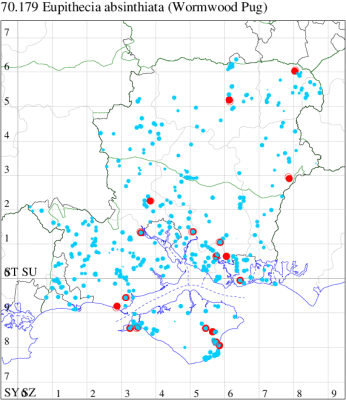 Common in gardens, saltmarshes, woodland and grassland throughout much of the British Isles. In Hampshire and on the Isle of Wight fairly common to common on waste ground and in woods and large gardens. Wingspan 21-23 mm. The main confusion species is Currant Pug E. assimilata, but Wormwood Pug is larger, with more distinct markings. Larva feeds on Mugwort, Yarrow, Common Ragwort, Wormwood, Sea Aster, Goldenrod and Canadian Goldenrod, over-wintering as a pupa.