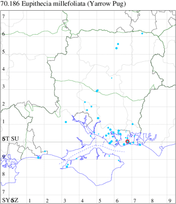 Nationally scarce (Nb) in waste ground, sand-dunes, shingle beaches, roadside verges and rough grassland, in south-eastern England, predominantly coastal. In Hampshire and on the Isle of Wight a fairly recent arrival, first recorded in 1951 and now well-established on waste ground near the sea in south-east Hampshire and re-discovered on the Isle of Wight in 1998. Wingspan 19-23 mm. The most likely confusion species is Grey Pug E. subfuscata, but Yarrow Pug has a less rounded forewing and is less uniformly grey. Larva feeds on flowers and seedheads of Yarrow, over-wintering as a pupa.