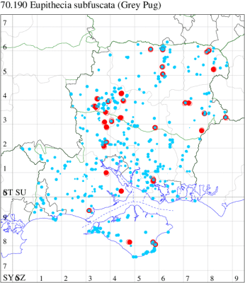 Common in a wide variety of habitats, from gardens, heathland and woodland, to downland and marshes throughout the British Isles. Widespread and common in Hampshire and on the Isle of Wight. Wingspan 17-21 mm. A large, grey pug with a small discal spot, one of the commonest species of Eupithecia, and familiarity with this species is the key to the identification of other, less common species; a unicolorous form is very similar to unicolorous forms of Green Pug Pasiphila rectangulata and several other pug species. Larva feeds on various woody plants, including Hawthorn and Blackthorn, and herbaceous plants, including Ragwort and Yarrow, over-wintering as a pupa.
