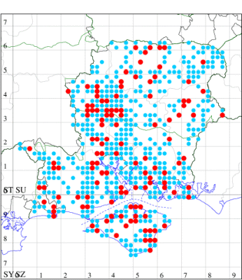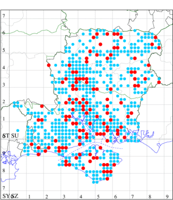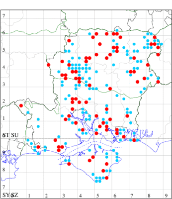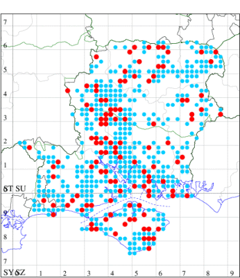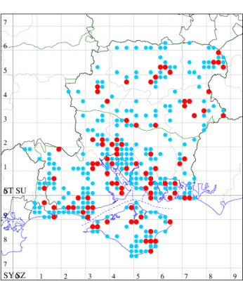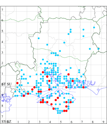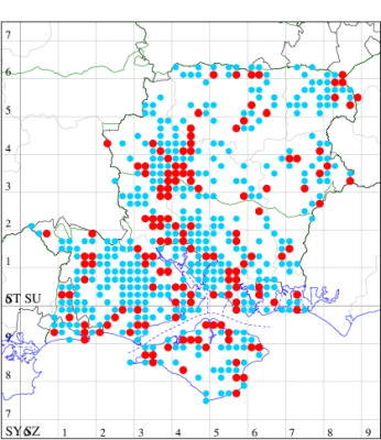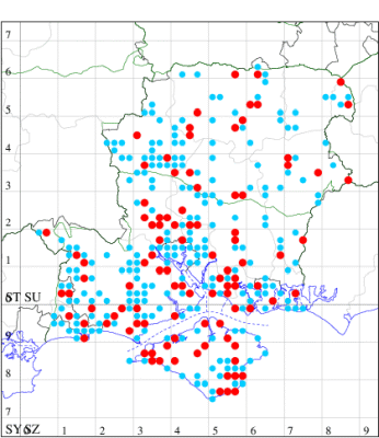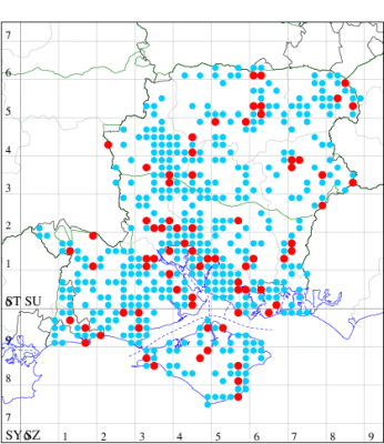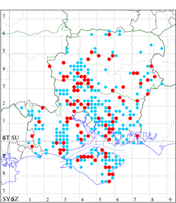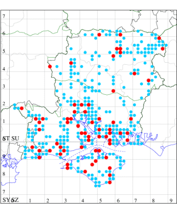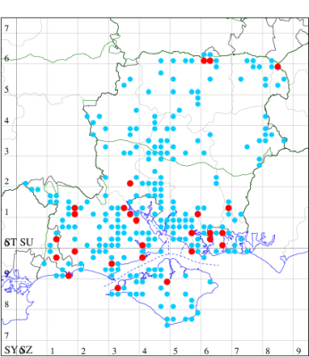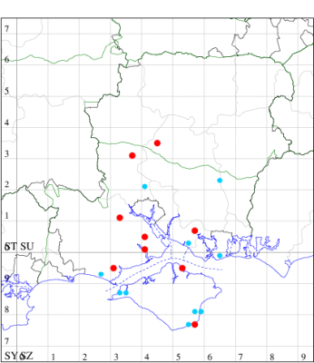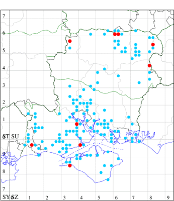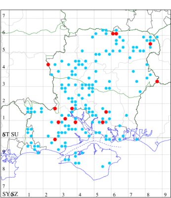 For the maps, all records prior to 2022 are shown by a blue dot (the larger the dot, the more recent), with the current year's records shown in red. As previous records are superimposed on any report for 2022, new sites have greater emphasis (i.e. will show as 'more red').