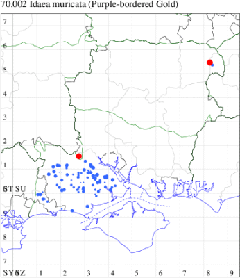 VC11: Ogden's Purlieu, NF, two, 17 Jun (AMD); Woodlands, NF, present, 07 Jul (CyJon); Dibden Purlieu, NF, one, 28 Jun (RAC); Hengistbury Head, three, 27 Jun (MJef); Sway, one, 18 Jun (SKee); Needs Ore NNR, three, 10 Jun; five, 16 Jun; one, 01 Jul; one, 16 Aug (CNB)
