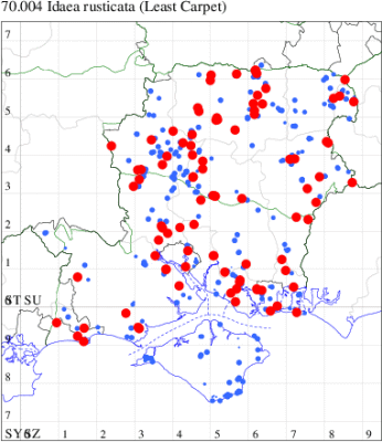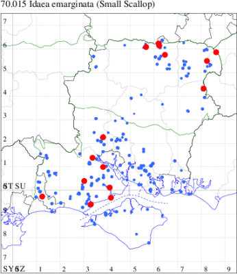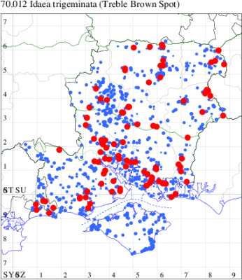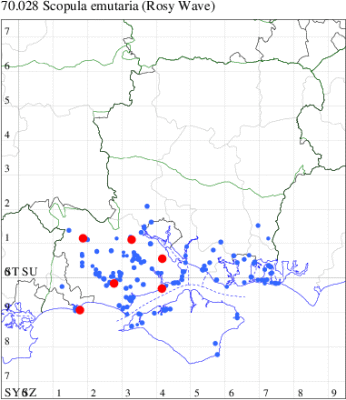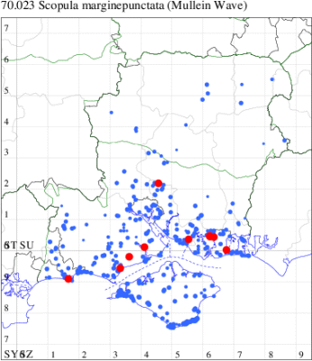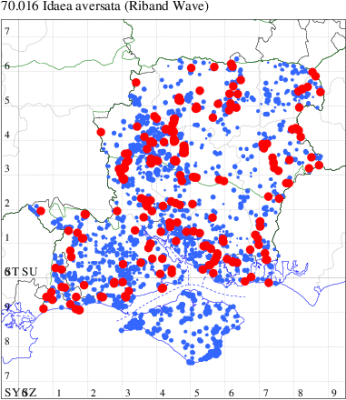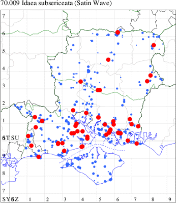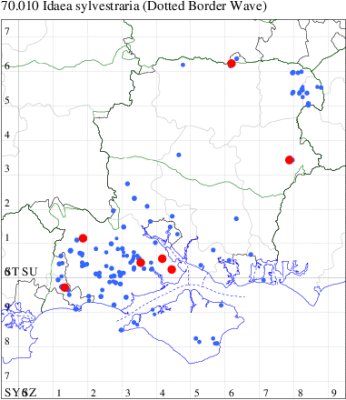 Common in woodland, scrub, hedgerows, rough grassland and gardens throughout much of southern England, less frequent in south-western and northern England. In Hampshire and on the Isle of Wight fairly common locally, on heaths and amongst tall grasses on downland. Wingspan 22-25 mm. The most likely confusion species are the very much less common Dotted Border Wave I. sylvestraria, which is very much confined to the heathland of the New Forest and the north-east.
