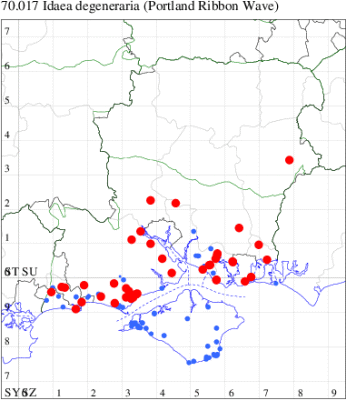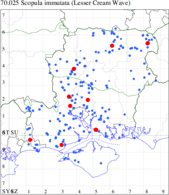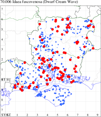 Nationally scarce (Nb) in scrubby heathland, mostly in south-eastern England, with scattered colonies from Sussex to Yorkshire and Lancashire. In our area, scarce but most frequent in the New Forest, with occasional reports from the north-east of Hampshire, with scattered records from elsewhere: all records away from the core areas will require photographic evidence at least to confirm records. Wingspan 20-23 mm. Apart from the very local Silky Wave I. dilutaria, which may also have small terminal dots on both wings, the main confusion species is Satin Wave I. subsericeata, which usually lacks terminal dots; Dwarf Cream Wave I. fuscovenosa has terminal dashes instead of dots. Larva feeds on Wild Thyme, Dyer's Greenweed and Petty Whin.