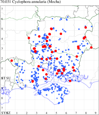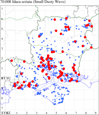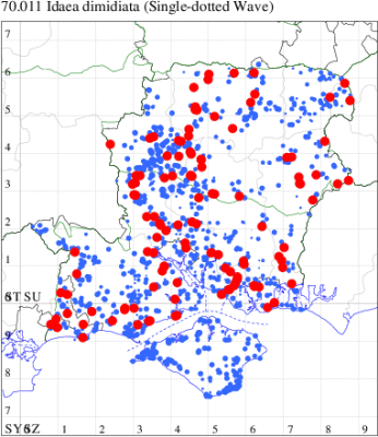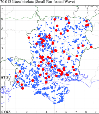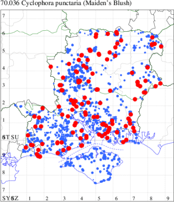 For the maps, all records prior to 2023 are shown by a blue dot (the larger the dot, the more recent), with the current year's records shown in red. As previous records are superimposed on any report for 2023, new sites have greater emphasis (i.e. will show as 'more red').